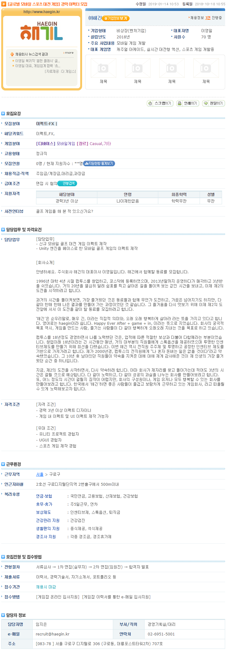 ㈜해긴- [글로벌 모바일 스포츠 대전 게임] 경력 이펙터 모집