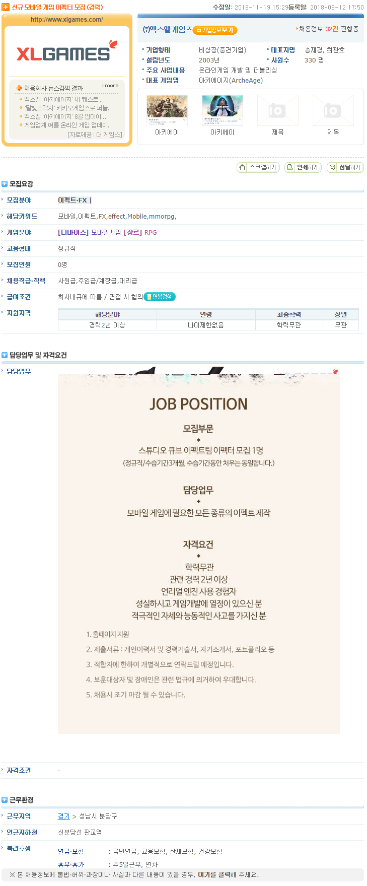 [엑스엘게임즈]신규 모바일 게임 이펙터 모집 (경력)