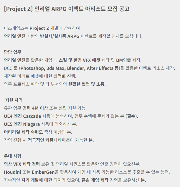 [NeedsGames}니즈게임즈 Project Z 에서 언리얼4/5 이펙터분을 모집합니다