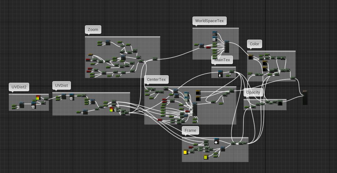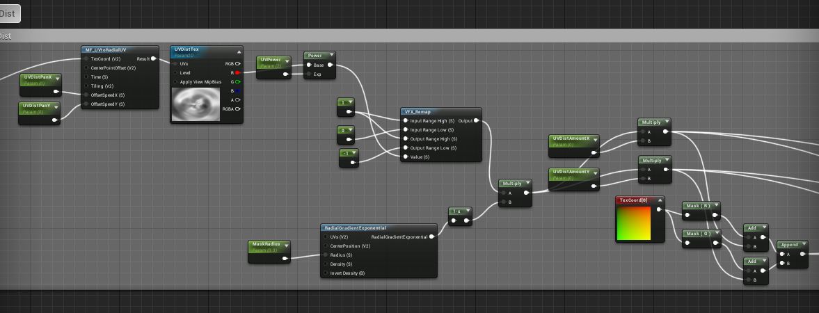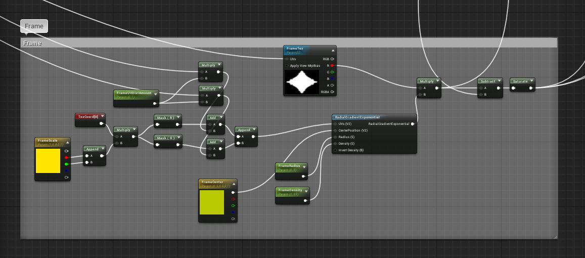 Then we’ve got the frame of the effect. In the top left, I’ve got the UV distortion stuff coming in (which is separated by X and Y amounts; I’ll get to that later), and then a scaling parameter so I can adjust how far out the frame goes either horizontally or vertically. This is why I also have the center shifted on the radial gradient, which just helps fade out the edges of the frame texture.