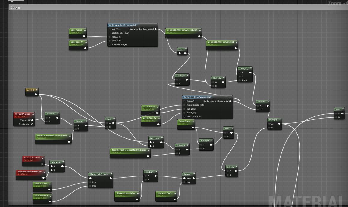 Next up is the section I titled “zoom”. It’s a little bit of a mess (sorry), but basically what this does is create that rippling effect in the world texture and the center texture to give it a bit more of a depth feel. So, the central radial gradient is used as UV distortion to achieve that. To the center left of it, I have it set to adjust its center location based on where it is on the screen, and then the further it is from the center, the more it multiplies the distortion. In the bottom left, it adjusts the distortion amount based on distance from the camera, so it doesn’t stay super distorted from far away, and as you get closer in opens up a little for a fun effect.