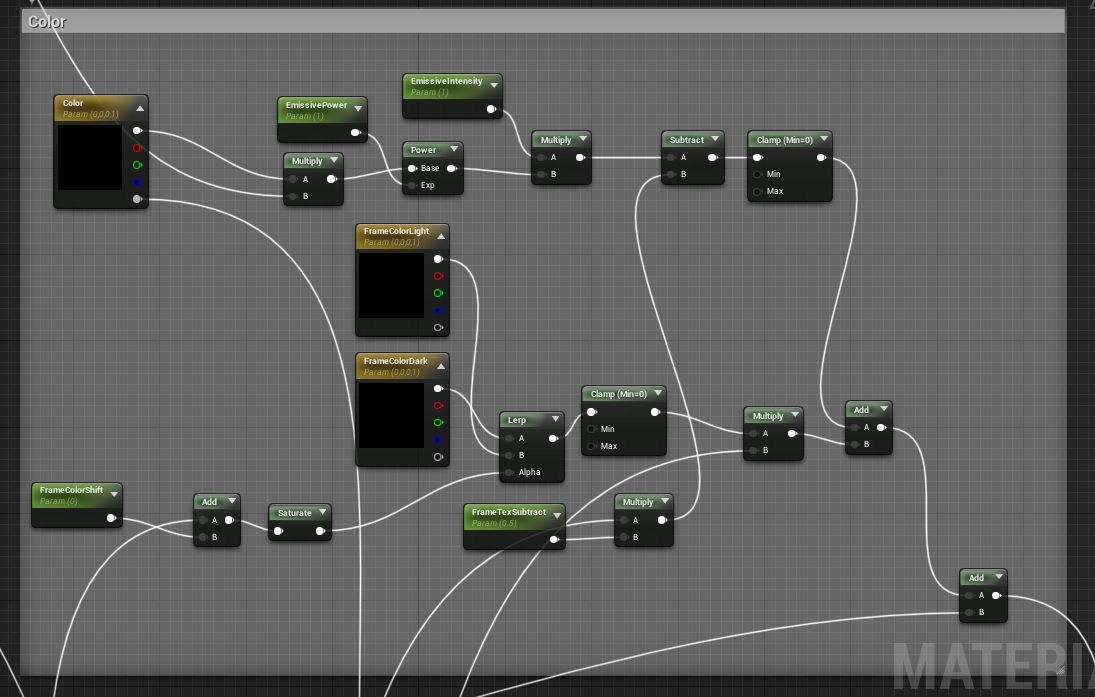 So here’s an overview of the material (and forgive my strange organization :sweat_smile:). I tend to use parameters for all of my values so that I can adjust things easily in a material instance to get the right values without having to recompile the material after every change. This saves me a lot of time since my computer isn’t a beast, but it does mean the values and textures in all my screenshots don’t reflect the actual values used in the material instance.