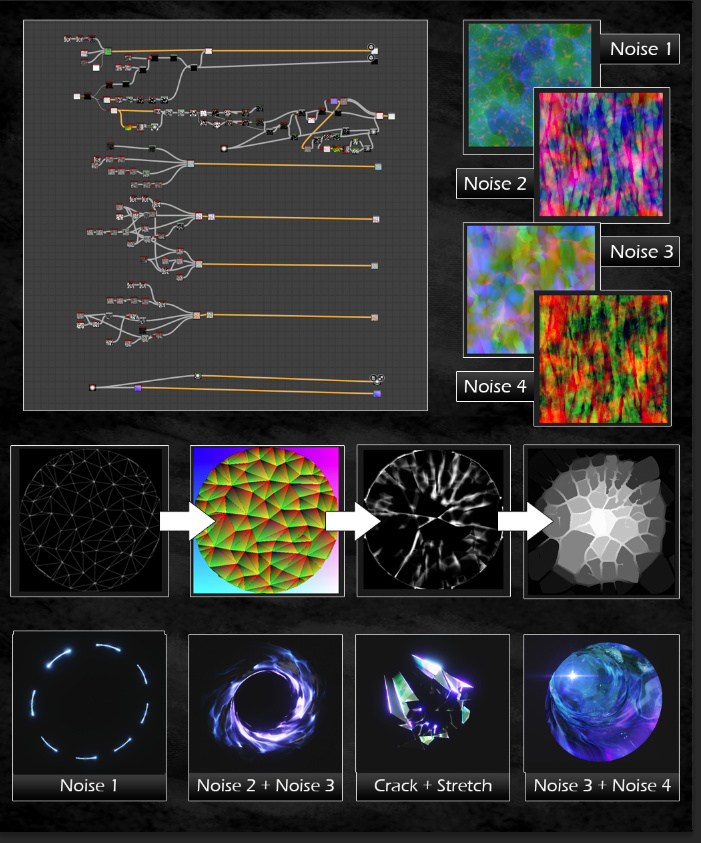 I used a couple of really low-poly meshes for this one. Nothing really complex here, I just used a couple of basic shapes, lots of vfx textures + custom shaders and a bit of vertex painting and UV stretching to control how stuff works.