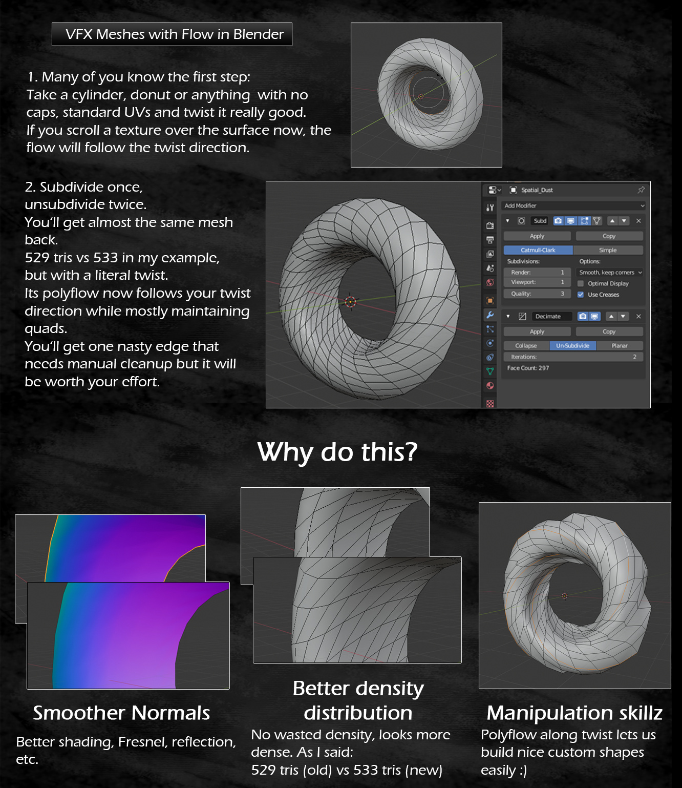 At this point I could also iterate on the mesh quite a bit since the process of texture creation and behaviour was basically pipelined as long as I baked the position and Z gradient into the two additional UV sets each time (this would have been nicer in Houdini but it’s just a couple of clicks in Blender :grin: ).