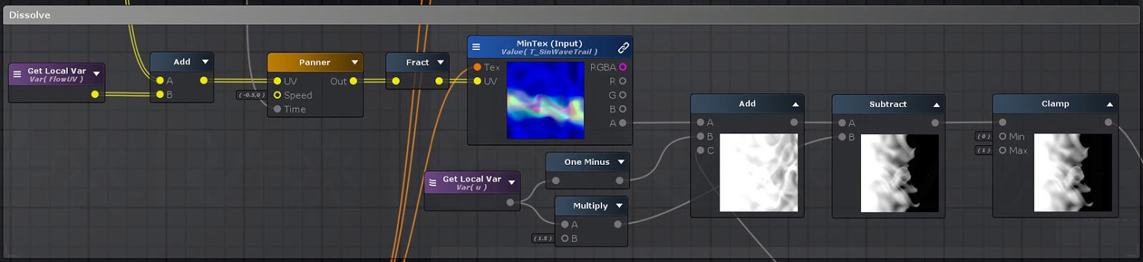 3. In order to make the trail animation to be more variety, need to add some distortion into UV. The Flow UV block work with two motion from B channel of texture and multiply the parameter value to control the strength of distortion. Multiply U coordinate to keep shape in the start position (left) and more distortion to end (right).