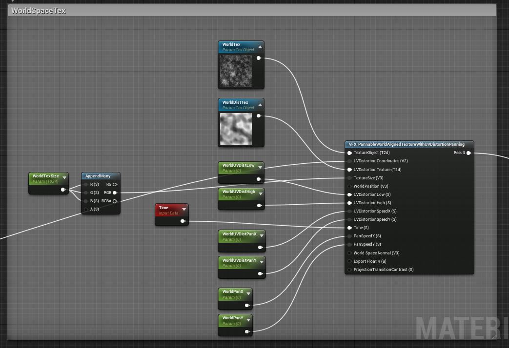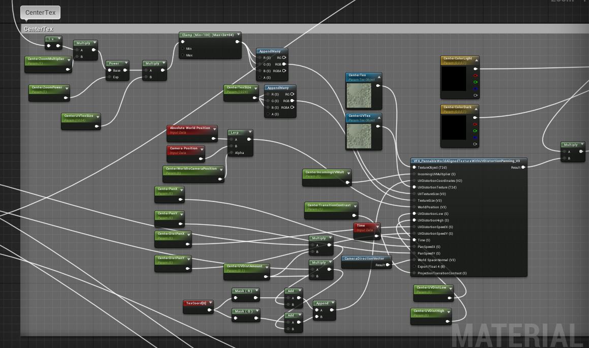 Next is the “CenterTex”, which is the lightning-like effect. This also makes use of an adjusted world aligned function. In this one, both the UV distortion texture inside and the main texture are world aligned. I also set a parameter that lerps between using world position and camera position, so moving the camera gives it movement as well. In the top left, I’m pulling the zoom distortion to affect the scaling of the UV distortion texture, which makes it kind of spiral into those ripples. Past that, I’m just sending the main UV distortion from other sections into this as well, so it all is a bit unified.