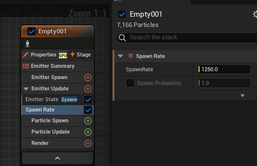 1.4 EmitterUpdate 카테고리 아래에 SpawnRate를 추가하고, 발사율을 125로 설정하세요.