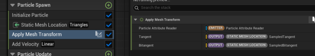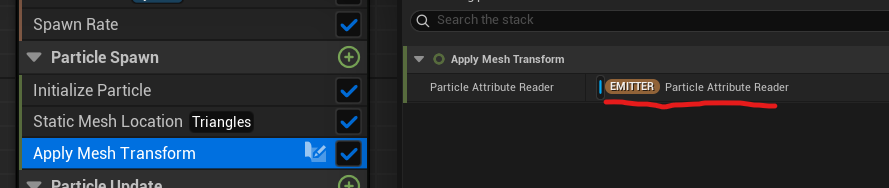 다음으로, Particle Spawn에서 Scratch Pad Module을 생성하고 ApplyMeshTransform이라고 이름을 지정하세요. 이 모듈 내부에서 메쉬의 위치, 스케일, 회전을 가져와 파티클 위치에 적용하겠습니다.