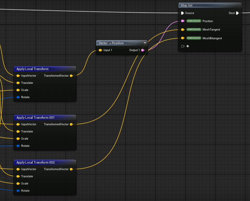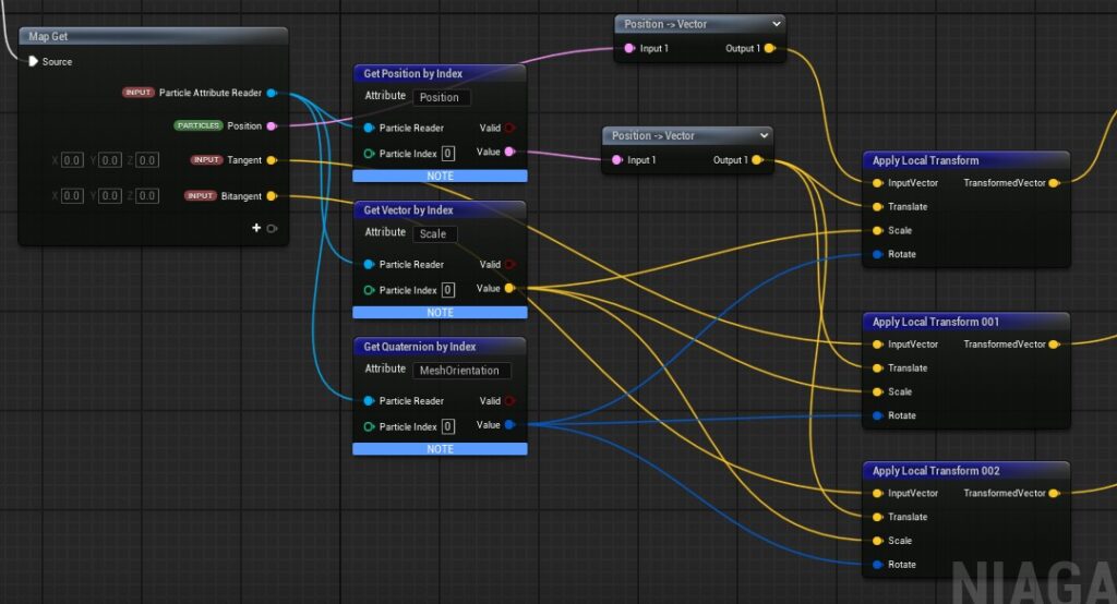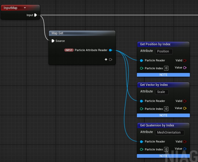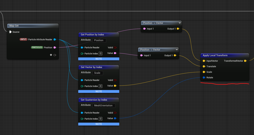 ForInputVector의 경우, 파티클의 원래 Position(을 Map Get을 통해)을 사용하세요. Position에서 Vector로의 변환 노드가 자동으로 생성되지만, 이는 대형 월드 지원을 위한 것이며 여기서는 무시해도 됩니다.