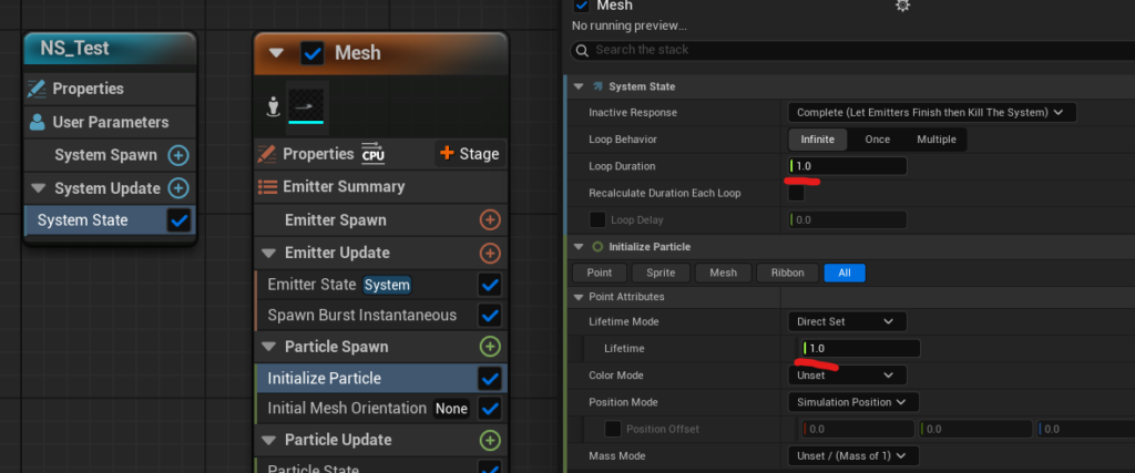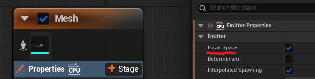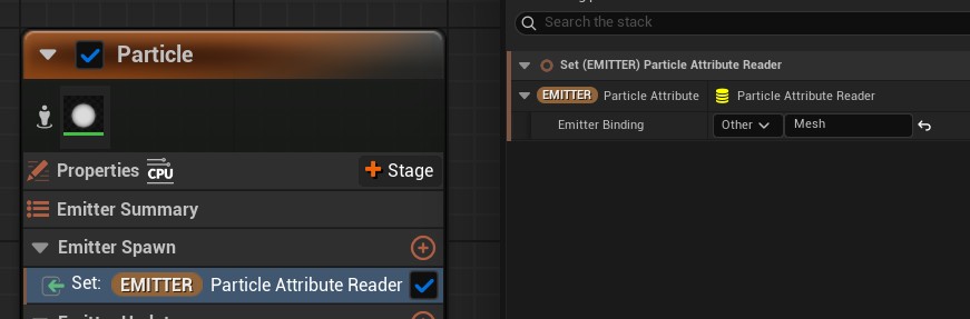 이를 Emitter Spawn에 추가하고, Emitter Binding을 읽어올 에미터의 이름으로 설정하세요—in this case, Mesh.