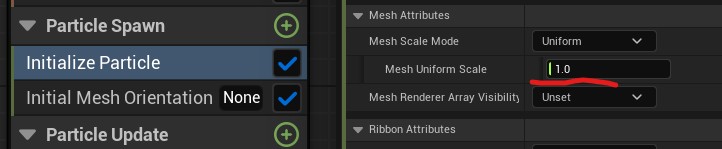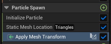 그러나 메쉬 파티클의 스케일, 위치 또는 회전을 수정하면, Static Mesh Location을 통해 생성된 파티클은 여전히 기본 메쉬 변환을 기반으로 하게 됩니다—이로 인해 눈에 띄는 오프셋이 발생합니다.