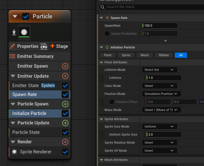 이로써 Niagara에서 생성된 Static Mesh로부터 파티클을 스폰하는 기본 설정이 완료됩니다.