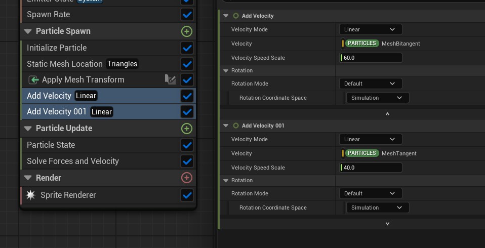 두 개의 Add Velocity 모듈을 결합하고 속도 스케일을 조정하면, 메시 형태를 따라 파티클 움직임을 자유롭게 제어할 수 있습니다.