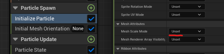 메시 파티클의 Mesh Scale Mode가 Unset으로 설정되어 있더라도, 메시가 시각적으로 스케일 1로 나타나지만 Particle Attribute Reader는 올바른 스케일 값을 가져오지 않습니다.