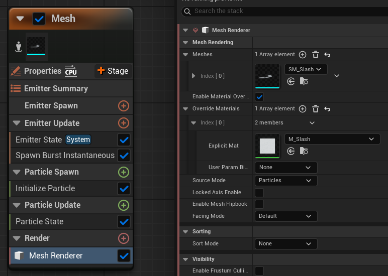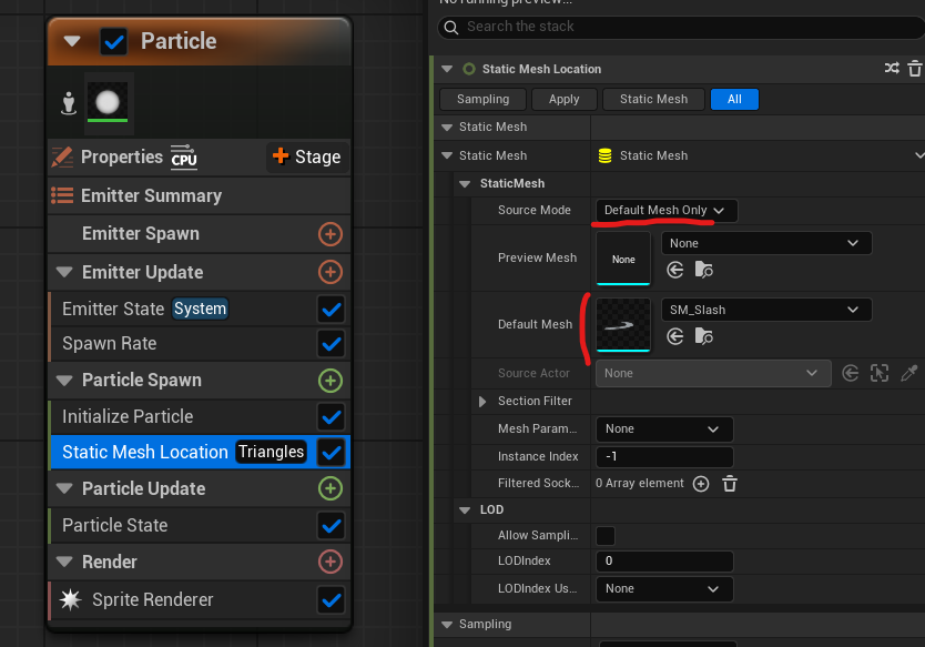 ParticleEmitter에서 Static Mesh Location을 추가하고, Default Mesh를 MeshEmitter가 생성한 slash mesh로 설정하세요.