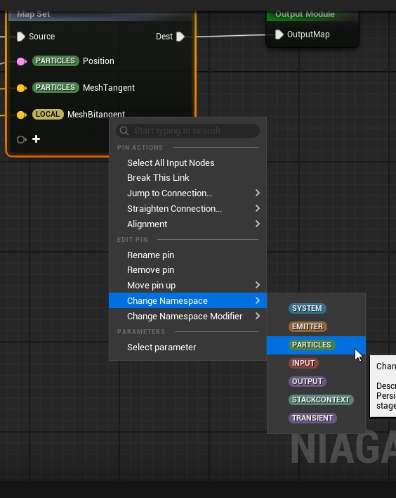 로컬 속성을 파티클 속성으로 변환하려면, Map Set에서 연결한 후 오른쪽 클릭하여 Change Namespace → Particle을 선택하세요.